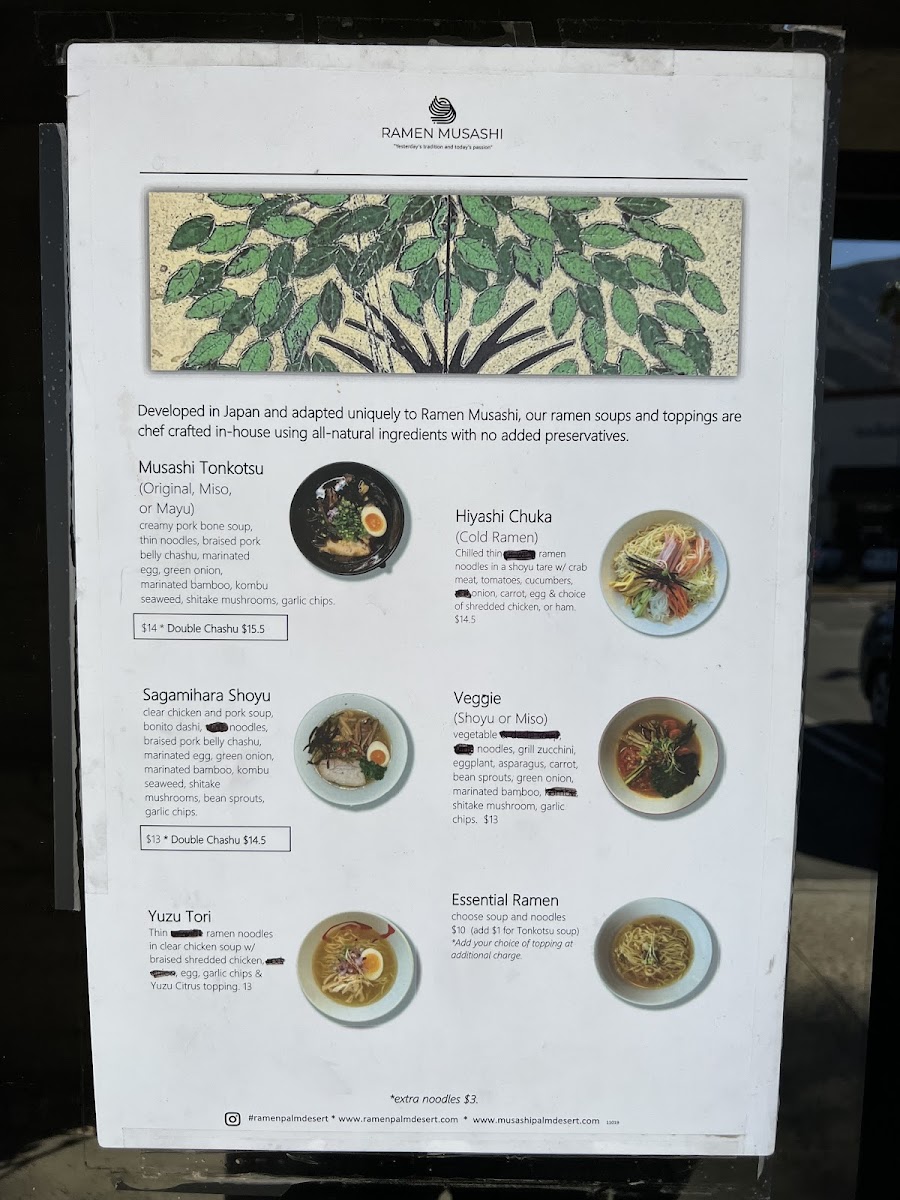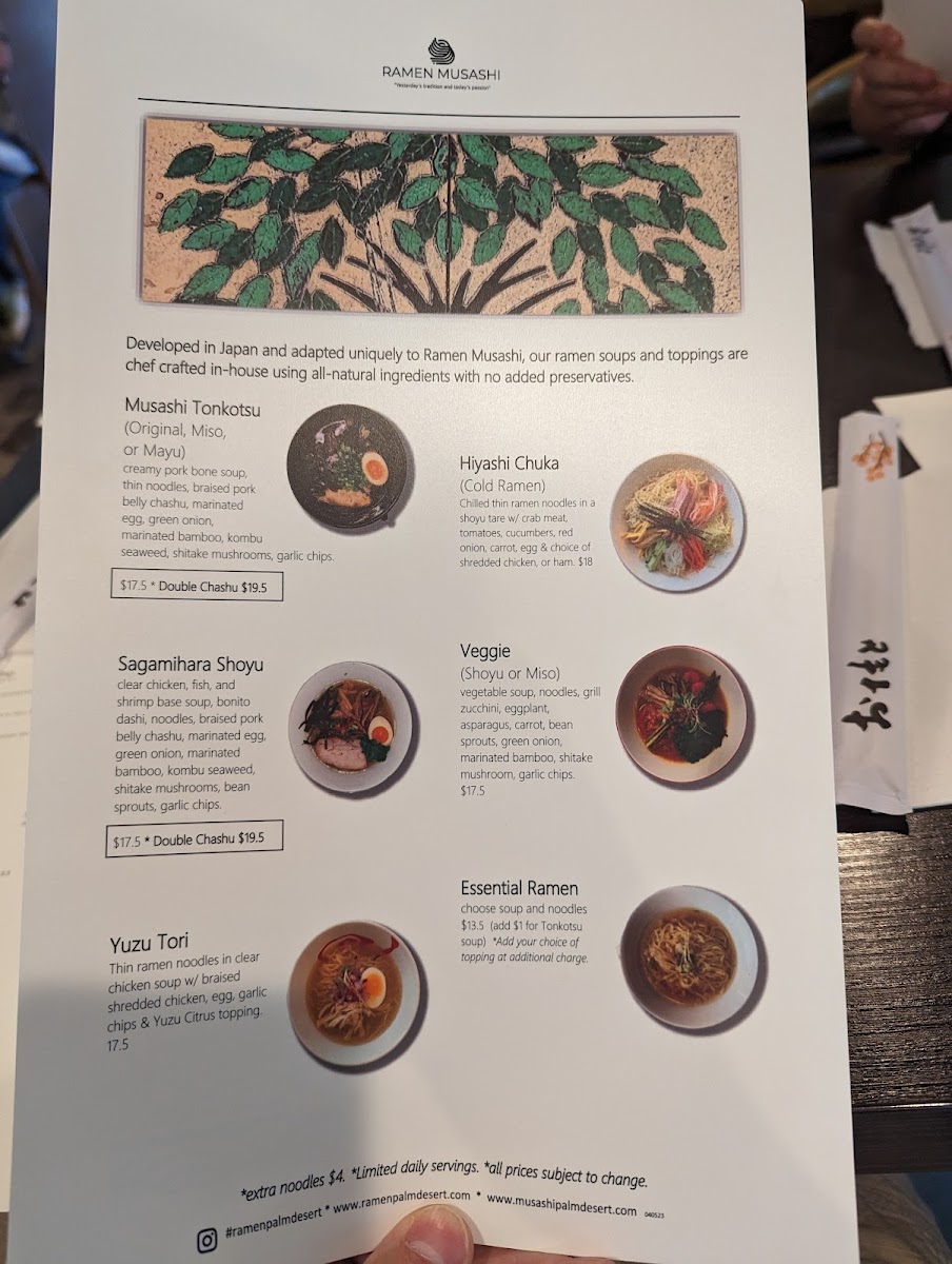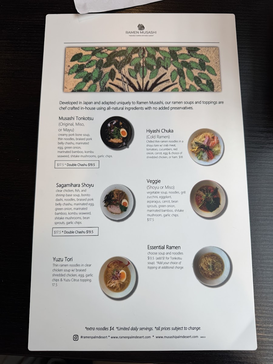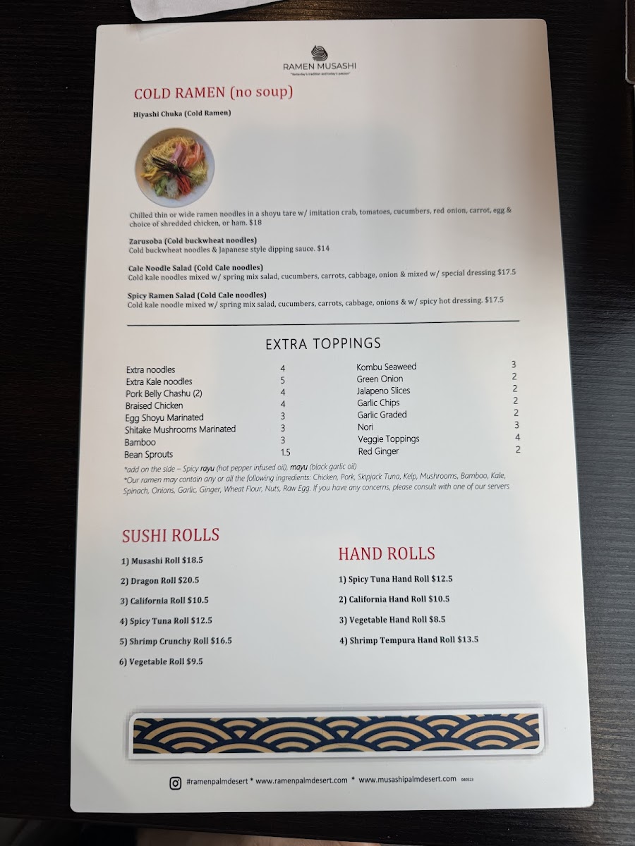 At Ramen Musashi Menu, you're in for a comforting and flavorful experience that will leave you craving more. Located in the heart of Palm Desert, CA, this spot offers an array of traditional and innovative ramen dishes, crafted with the freshest ingredients and bold flavors. From rich, savory broths to perfectly tender noodles, every bite is a satisfying journey for your taste buds. Whether you're a ramen aficionado or a newcomer to this beloved dish, you'll find something to enjoy on the menu. There’s a dish for everyone, from classic miso ramen to creative fusion options. Each bowl is made with care, delivering that perfect balance of taste and texture that defines a great ramen experience.
